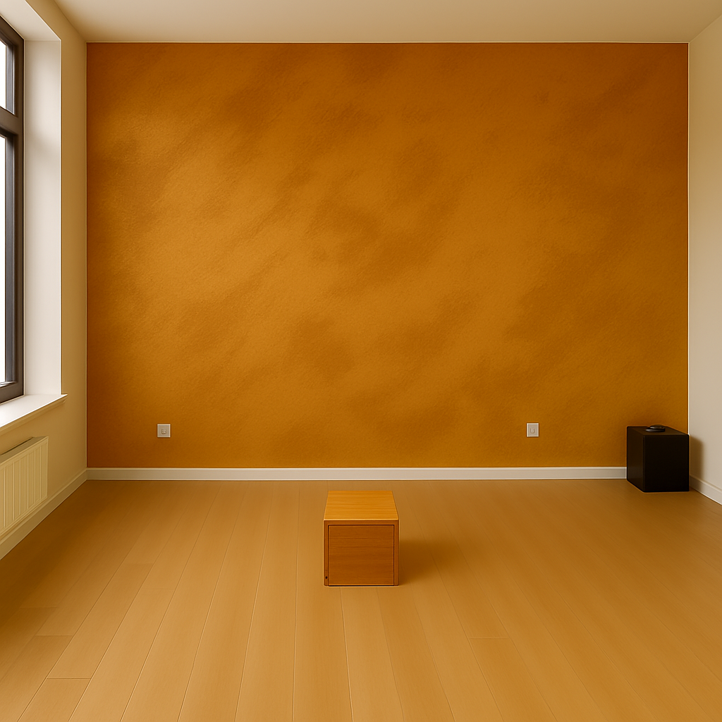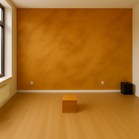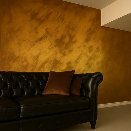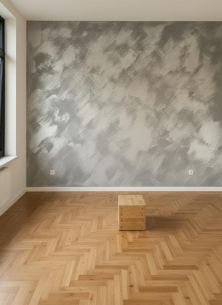 Applied with irregular, half-circular strokes using a handle-free brush or pad, this finish offers uniform color enlivened by sparkling metallic reflections. The sandblasted texture catches and scatters light, making metallic highlights more pronounced in the grainier areas, giving your space a refined yet artisanal character.