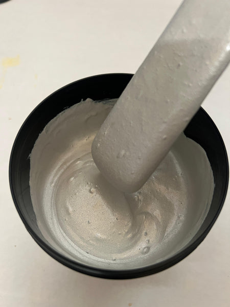 - Apply two coats — first with a short-haired roller for even coverage, then create the sandblasted metallic effect with your chosen decorative tool.