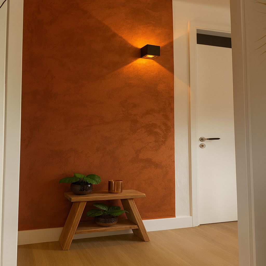 Applied with irregular, half-circular strokes using a handle-free brush or pad, this finish offers uniform color enlivened by sparkling metallic reflections. The sandblasted texture catches and scatters light, making metallic highlights more pronounced in the grainier areas, giving your space a refined yet artisanal character.